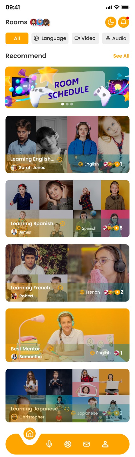 Audio Discussion Rooms: Multi-user voice chat groups where users can join topics to practice speaking different languages.